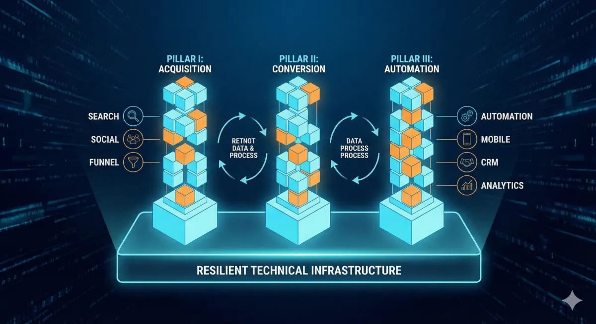 A robust growth function requires a holistic architecture that simultaneously addresses acquisition, conversion, and automation. A failure in any single pillar creates "lead leakage," where hard-won traffic fails to convert or dissipates due to inadequate follow-up systems.