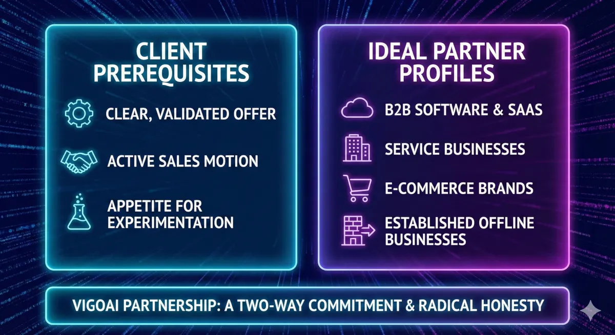 A high-performance marketing engine requires a specific environment to function. As such, this partnership is a two-way commitment that necessitates client-side readiness to ensure the VigoAI engine delivers its full potential.